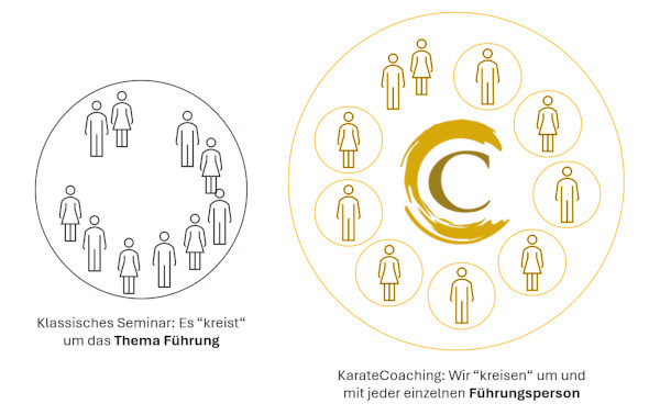Im Gegensatz zu klassischen Seminargruppen, in denen es um „das Thema Führung“ geht, geht es beim KarateCoaching um 8 Menschen innerhalb ihres eigenen Führungskontextes, die sich in ihre Führung hinein entwickeln. Anders gesagt, wir integrieren das Thema Führung in jeden einzelnen Kontext. Individualität und Effektivität „at its max!“